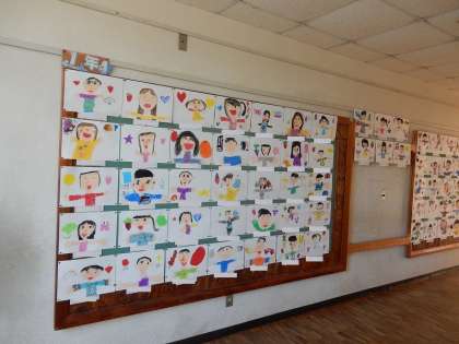 クレヨンで描いた、ぼく・わたしの絵が、中央廊下に掲示されました。
