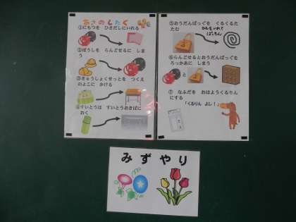1年生の黒板には、登校してからやることが掲示されていました。