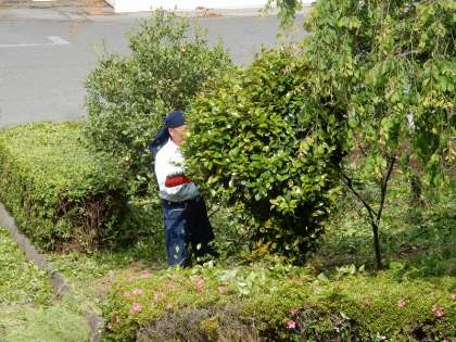用務員さんは、校舎周りの植栽のせん定をしていました。