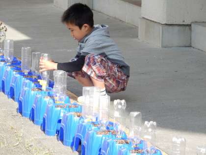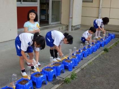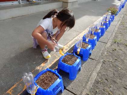 1年生は、9日(水)に種まきしたアサガオに、水を与えていました。