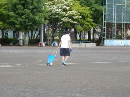 昨日の雨で消えてしまった運動場のラインを、先生が引き直していました。