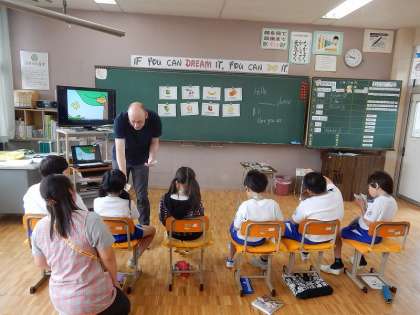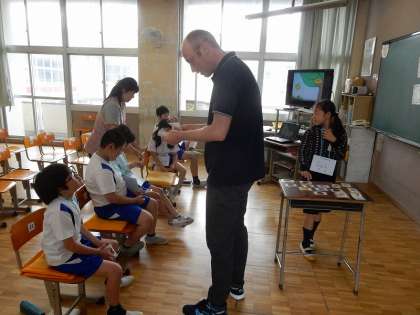 子どもたちが店員になって、スティーブ先生に果物などを売りました。