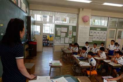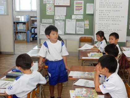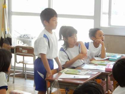 2年生に案内してもらった学校たんけんを振り返り、どんなところにどんなものがあったのか、どんな様子だったのかを発表し合いました。