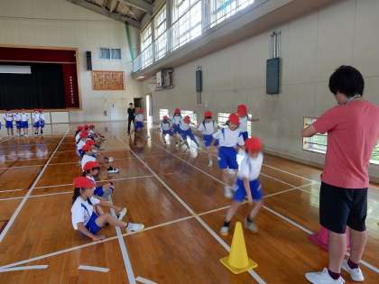 砂場では立ち幅跳び、体育館では反復横跳びに取り組みました。