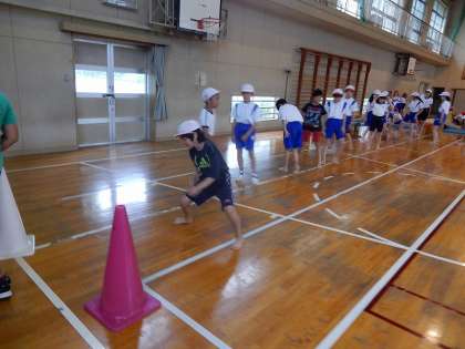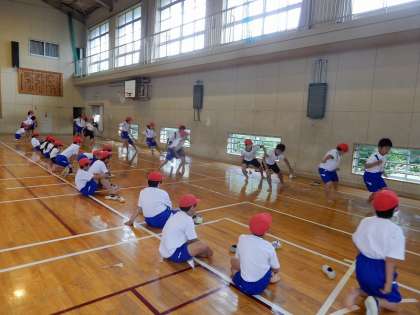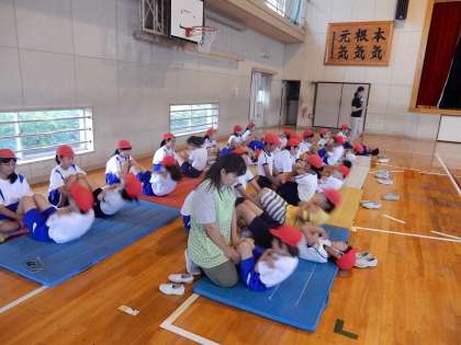 あいにくの雨だったため、体育館で「反復横跳び」「上体起こし」に挑戦しました。