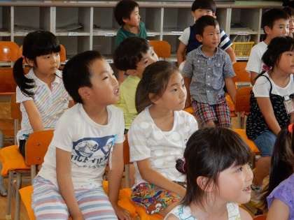 子どもたちは、その絵を見て、英語で果物の名前を言います。