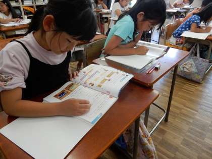 教科書の縦の長さと横の長さを、方眼のマスの数を使って比べました。