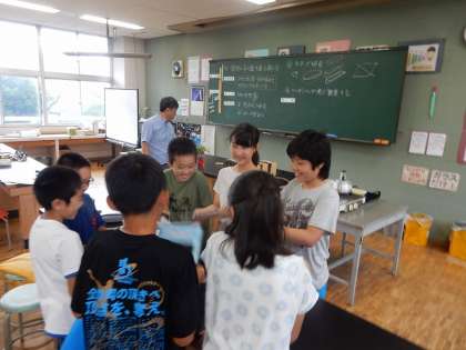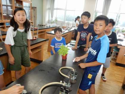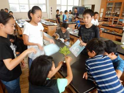 根から取り入れた水がどこを通って、植物全体に行き渡るか、色を付けた水を吸わせて確かめています。
