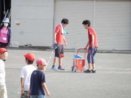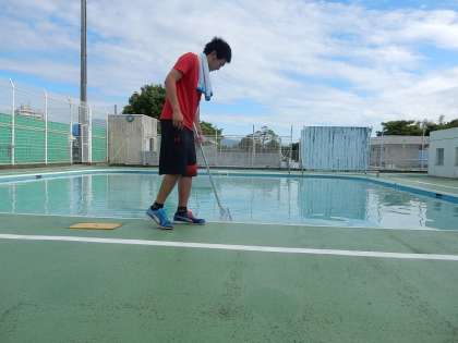 先生方は、すっかり消えてしまったラインを引き直したり、プールの掃除をしたりしていました。