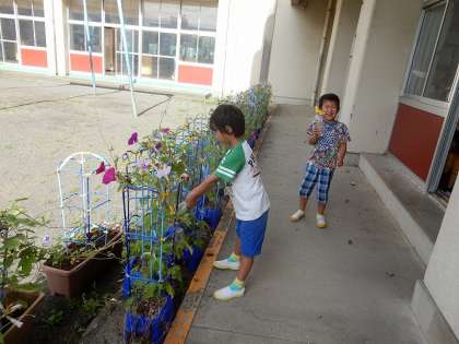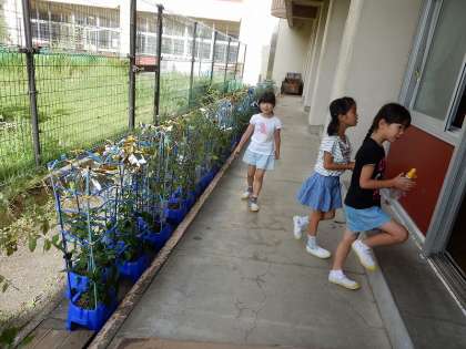 2年生は、トマトやピーマンの出来具合を見ていました。