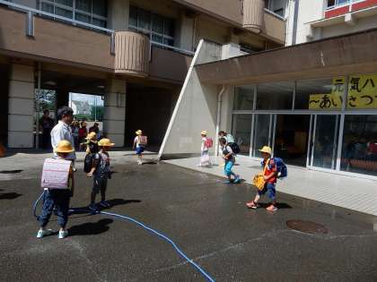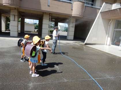久しぶりの強い日差しで、教頭先生が打ち水をしてくれました。
