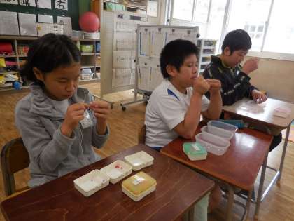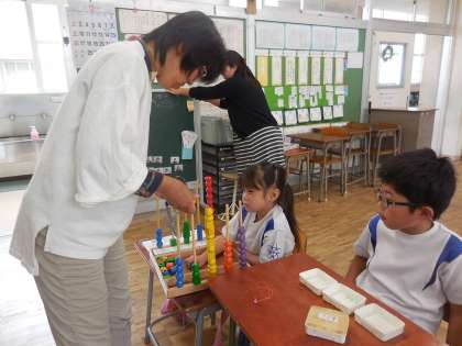 指先の器用さを高めるため、1年生は棒に積み木を刺し、3年生以上は小さなビーズに糸を通す作業に取り組みました。