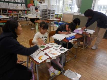 1年生は、食べ物の名前を覚えるために、「○○はどれ?」の問いかけで、カードを選んでいました。