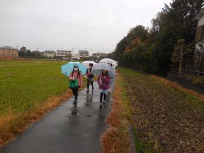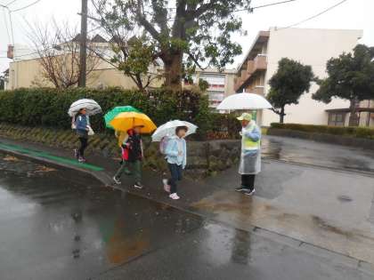 子どもたちが傘を差して登校してきました。