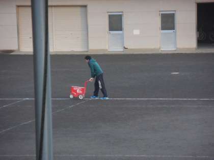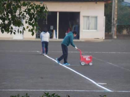 先生方は、運動場にトラックやサッカー用のラインを引いていました。