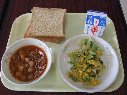 ウインナーと豆のトマトスープ 野菜ソテー 食パン 牛乳