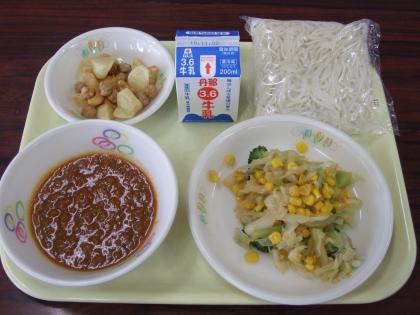 ミートソース ボイルドサラダ ポテトとひよこ豆の唐揚げ ソフト麺 牛乳