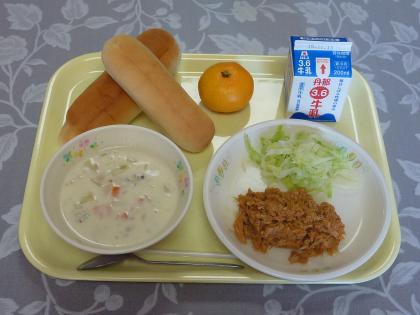・ツナドック ・ボイルドキャベツ ・クラムチャウダー ・みかん ・牛乳