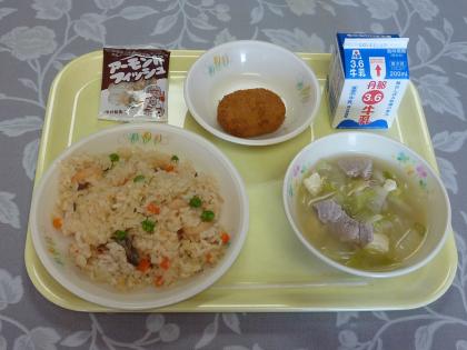 ・エビピラフ ・コロッケ ・豚肉と白菜のスープ ・アーモンド小魚 ・牛乳