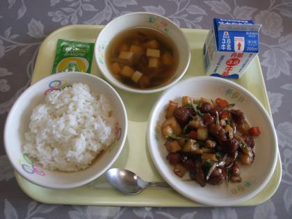 あげまぐろのごしきに わかめスープ ふりかけ ご飯 牛乳
