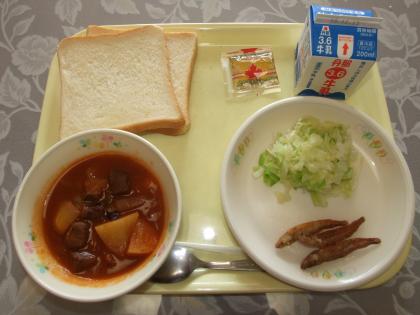 ボルシチ わかさぎの唐揚げ ボイルドキャベツ 食パン 牛乳 メープルジャム