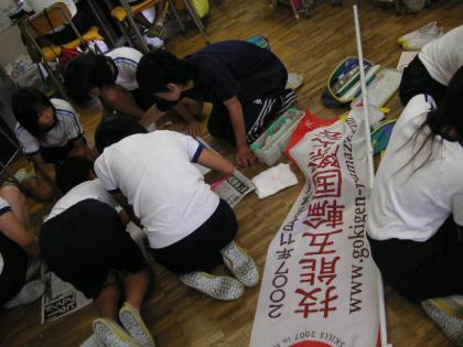6年生の総合の時間に、ジャンボフラッグを作りました。エクアドルの国旗の柄が難しく手こずりました。会場で自分たちが作った旗を見るのをとても楽しみにしています。エクアドルの皆さんがんばってください。