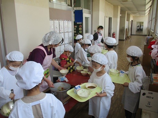 1年生は今日から給食がスタートしました。配膳ではみんなで協力しながら準備をすることができました。