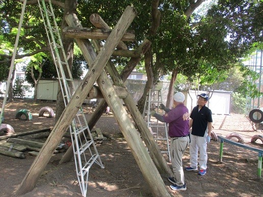 用務員さんが校内整備作業として、不用遊具の撤去を行っています。遊具撤去後は憩いのベンチに生まれ変わる予定です。