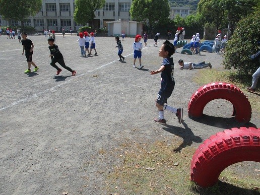 休み時間の様子です。グラウンドでは、かけっこをしたり、ボール運動をしたりする等、みんなで楽しく活動していました。