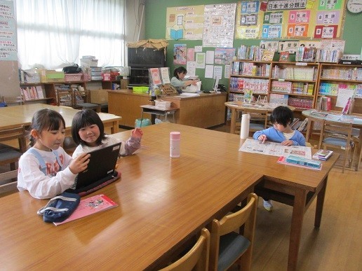 学校図書館支援員が、子供たちのために学校図書館が使いやすいよう様々な整備をしています。休み時間の応対や学習支援なども行っています。