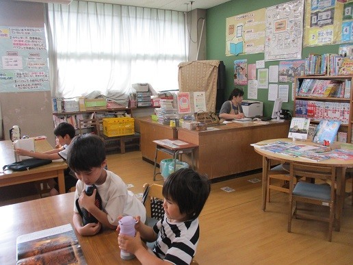 2年生が学校図書館を利用していました。図書館支援員が子供たちに年齢に合った本を紹介していました。