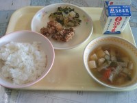 今日の給食は、「ご飯、牛乳、鶏肉のおちゃめ揚げ、白菜とツナの煮浸し、けんちん汁」...