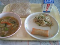 今日の給食は、「中華麺(みそラーメン)、牛乳、春巻き、もやしと胡瓜のごま酢和え」...