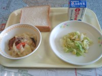 今日の給食は、「五目炊き込みご飯、牛乳、鮭のごま焼き、ほうれん草の炒め物、いも餅...