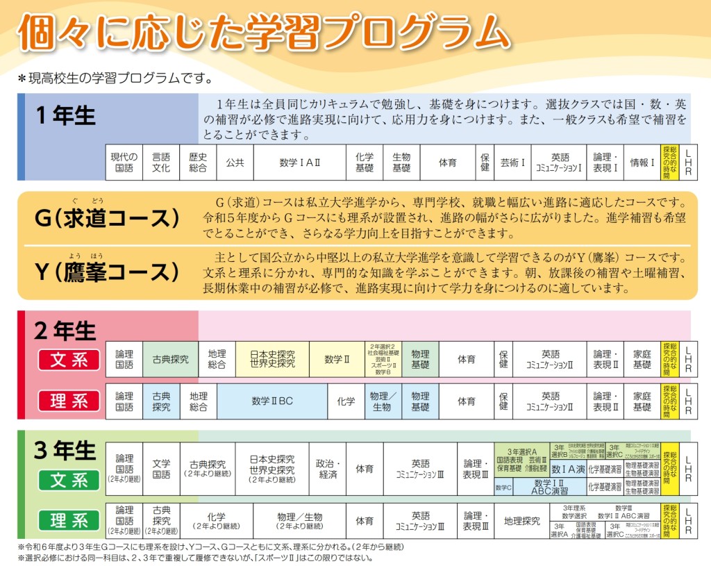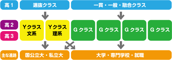 ※高2Yクラスは、希望者の中から選抜されます。高1の時点で、選抜クラス、一貫一般融合クラスどちらのクラスからでも希望することができます。