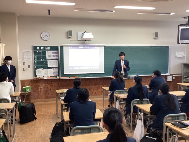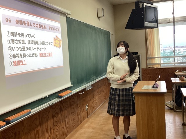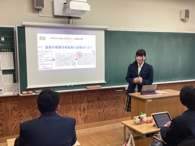 本日帰りのSHRの時間に、高校3年生計12名が高校2年生の教室に出向き、自分の進路について発表しました。今回は、総合型選抜や推薦型選抜によって進路決定した者の中の代表者が話をしました。受験に向けて取り組んだことや反省点、後輩へのアドバイスなど、具体的な話をいくつもしてくれました。高校2年生には、来年度の進路決定に向けて今からできることを実践し、今日の講話を役立ててほしいと思います。