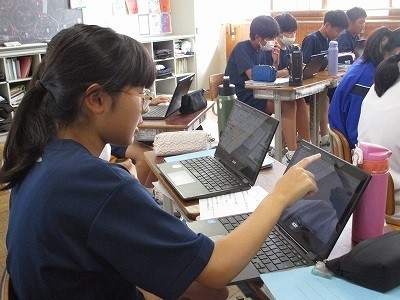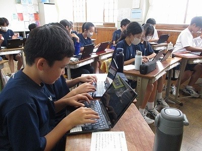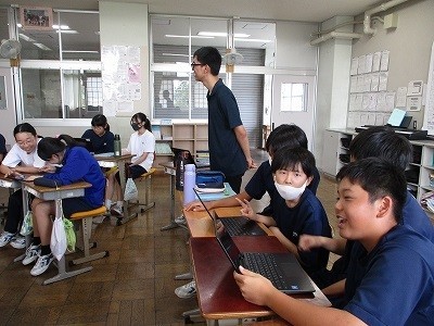 令和9年に統合する第二中学校とオンラインで授業を行いました。Googleスプレッドシートを用いて、第二中の生徒と”チャット”のように対話をしていきました。英語を用いて質問をしたり、答えたりしながら、交流していました。