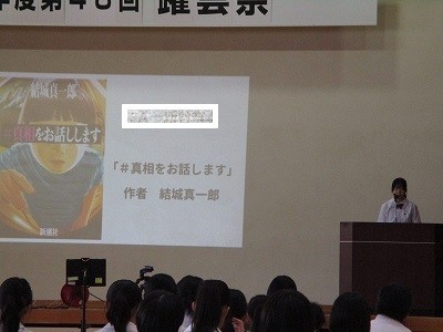 文化の部が行われました。言語読解の時間に行ったビブリオバトルの学年チャンピョンが発表しました。聴衆へ質問をして考える場をつくったり、本の一部分を紹介して続きが知りたくなるようにしたり、読んでみたい!と思わせる発表でした。