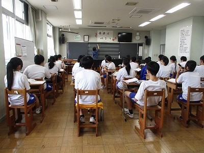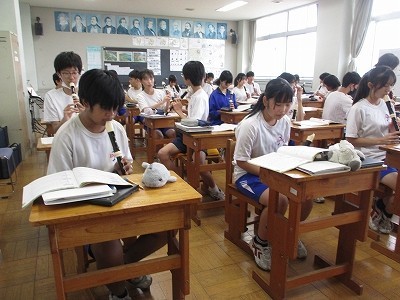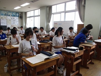 アルトリコーダーの練習をしていました。低い音の指使いを先生と一緒に確認しています。