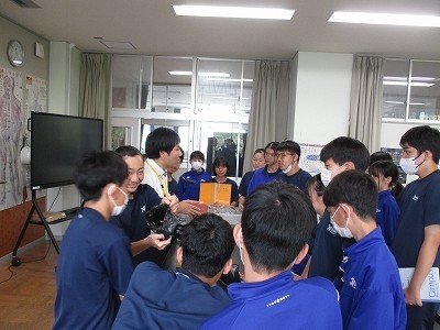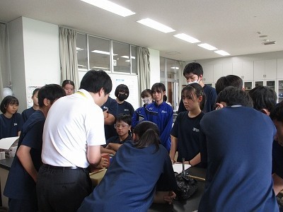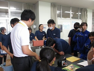 教室から理科室へ移動し、レンガをスポンジの上に先生が置きます。どの面を下にして置くかで、沈んだスポンジのへこみ具合が変ります。これをもとにして、圧力の計算をしていきました。