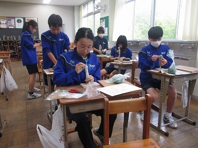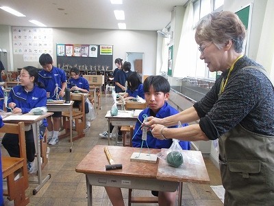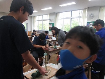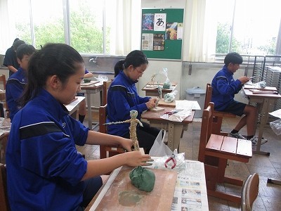 針金で骨組みをつくり、そこに新聞紙や麻ひもを巻いて、さらにその上に粘土をつけて人間の形をつくっていきます。本格的な粘土を扱うのは初めてです。乾かないように霧吹きをしてもらいながら作業していました。どんな作品ができるのか、楽しみですね。