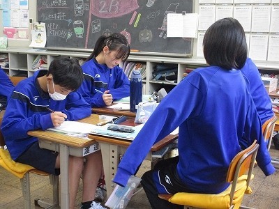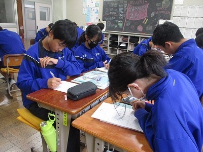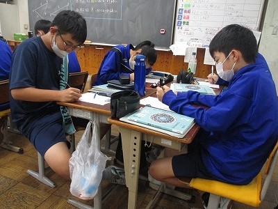 合同な図形の性質について学んでいます。問題を解きながら、合同な図形の性質を確かめていました。