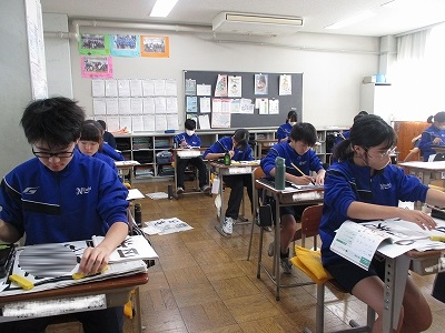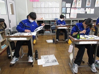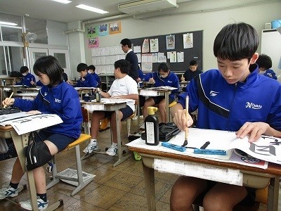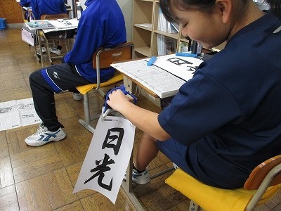 書写の授業です。「行書とはどんな字体なのだろう?」が課題です。書写の授業で、初めて行書で書きます。最初はお手本をなぞって書き、次に半紙にお手本を見ながら書いていました。書くときのワンポイントについて、先生から説明がありました。