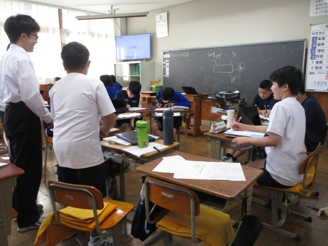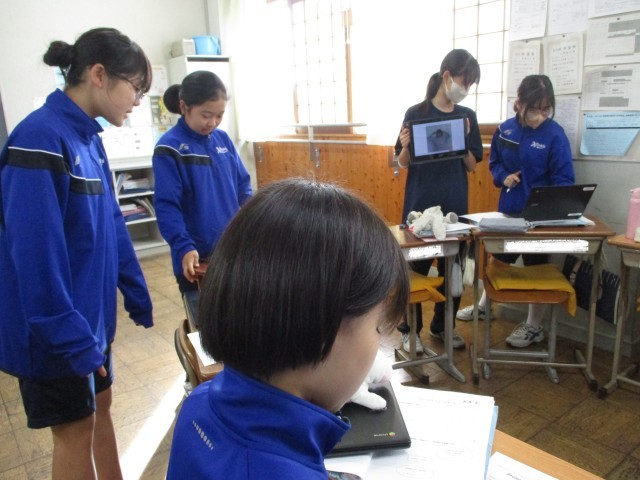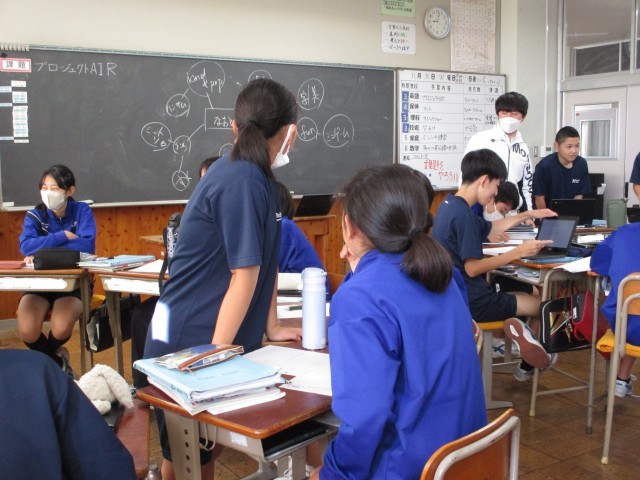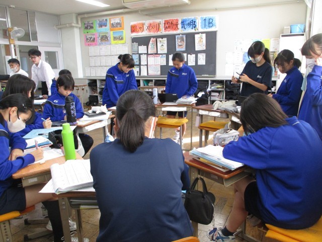 第二中の生徒へ第一中のことを伝える準備をしています。グループごとに伝えるジャンルを決めて、その魅力をどうやって伝えたらよいか、魅力的なプレゼンにするためにどうしたらよいかについて、他のグループの発表を聞きながら探っていきます。