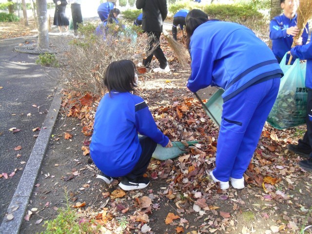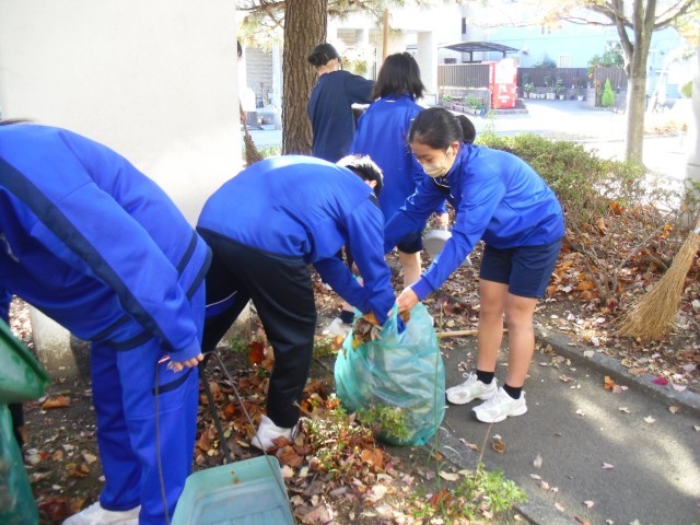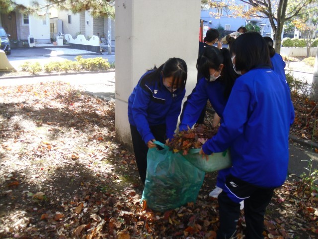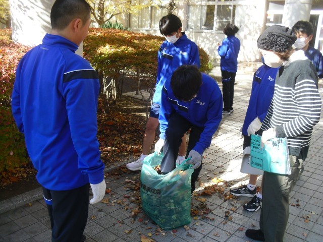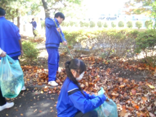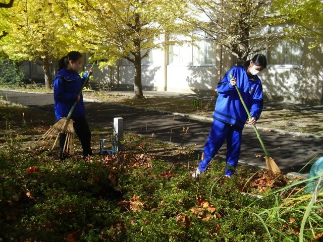 この季節になると、庭が落ち葉でいっぱいになってしまいます。今日は昼休みを利用して、整備委員が企画した落ち葉掃きを行いました。
