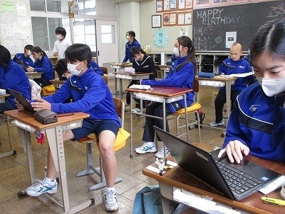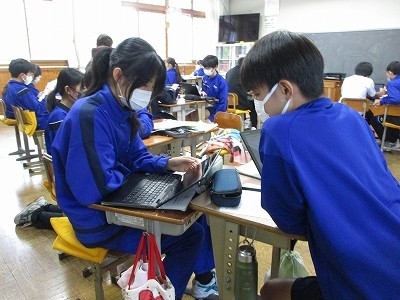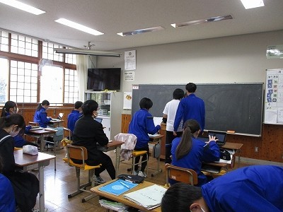 令和9年度、第二中との学校統合を控えています。2つの学校を1つにするための課題について考えてもらっています。自転車通学の生徒の駐輪場、生徒会組織はどうしたらよいだろうか? 新しい学校の校名はどのように決められるのだろうか? などについて調べていました。
