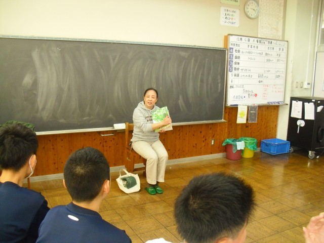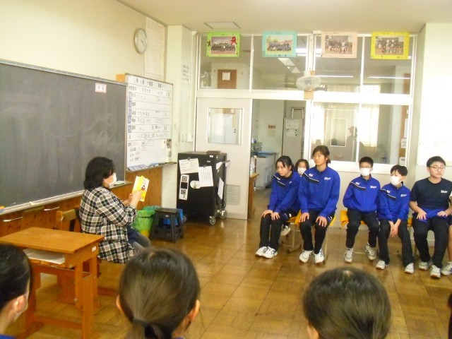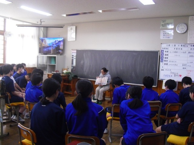1年生の生徒が、静かに耳を傾け、絵本の世界に浸っていました。