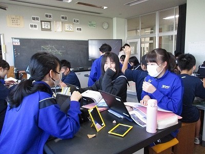 これまで学んできた光の性質と単元を学ぶアイテム”光の道筋”を活用して、”光のマジックショー”を説明していました。”光のマジックショー”は、単元の最初に先生が見せてくれたマジックです。例えば、鏡1枚で見えない部分を鏡2枚を用いと見えるようになること、Chromebookの画面を虫眼鏡を使って壁に投影できること、などです。授業のワークシートや教科書などを調べながら謎解きをしていました。