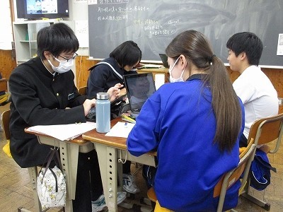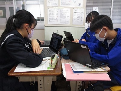 教科書の教材をもとに、「『誇りに思って生きることのできる村』とはどんな村?」についての考えを深めるために、沼津で誇れるものを探しています。少しインタビューしてみると、「沼津で誇れるものは海!」「誇れるものが沼津にないのでは・・・」「そもそも『誇りに思って生きる』ってどういうことなの?」などの声を聞くことができました。他者から見た沼津はどう映るでしょうか? 例えば、東京に住んでいる人は沼津のことをどう思っているのだろう? また、私たちは沼津について何を知っているのだろう? さて、授業を終えた生徒のみなさん、どのように考えが深まったでしょうか?