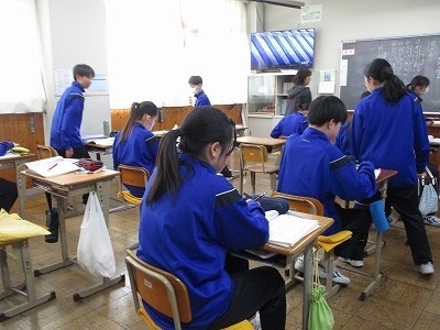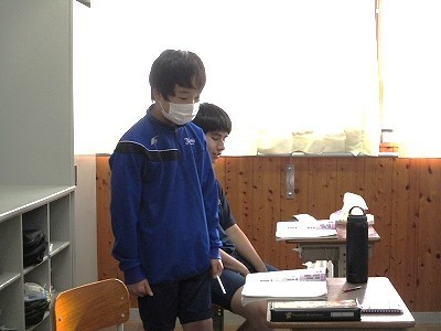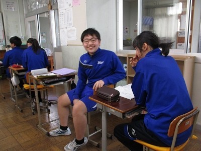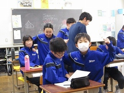 文法の学習です。「副詞」について学んだことをワークで確かめていました。教室内を自由に動きながら、互いに確認し合っていました。